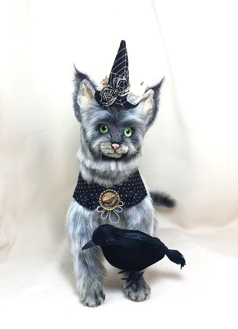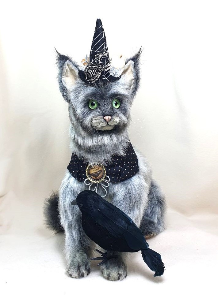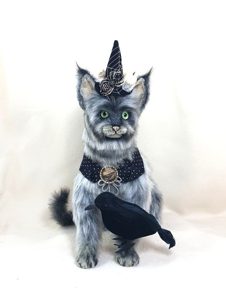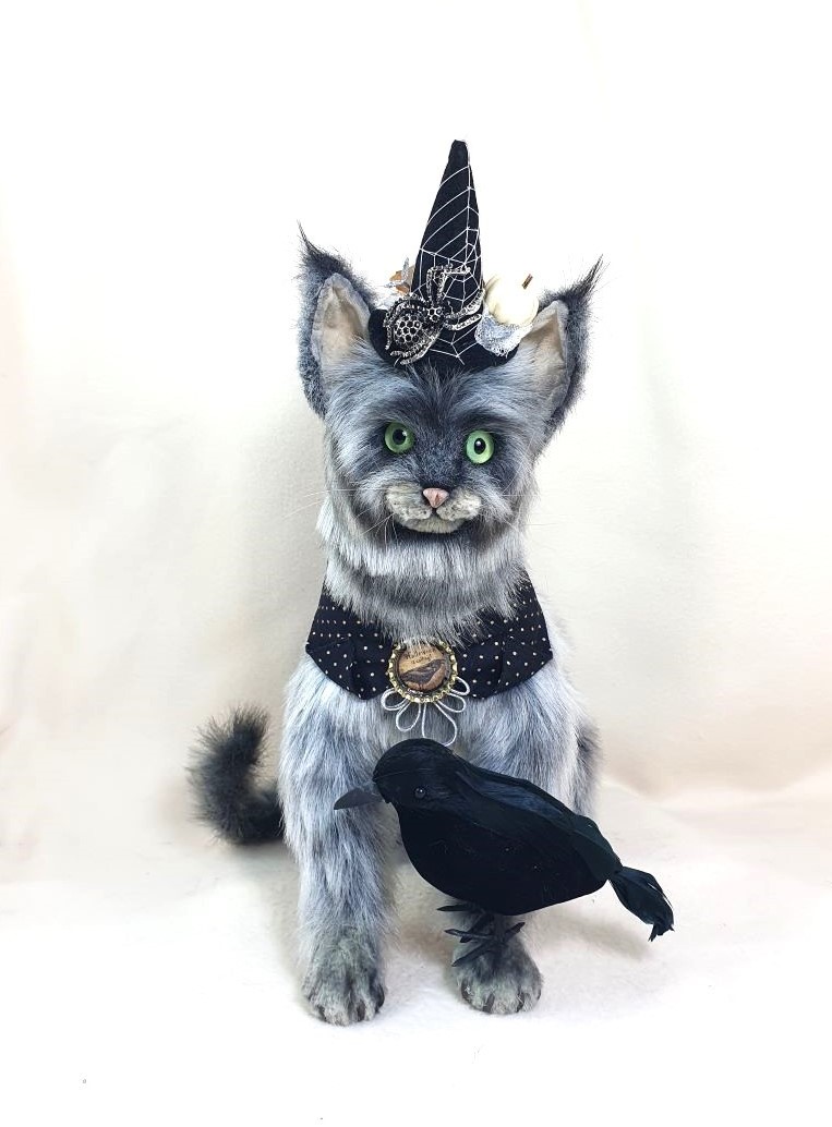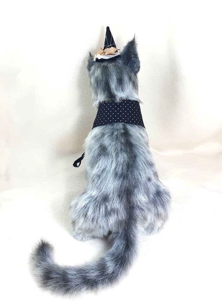 Decorations: hat 100% wool fiber, Ghost pendant, bow at the neck, vintage box with battery-powered pumpkin lights, tree, broom pendant, wooden crow.