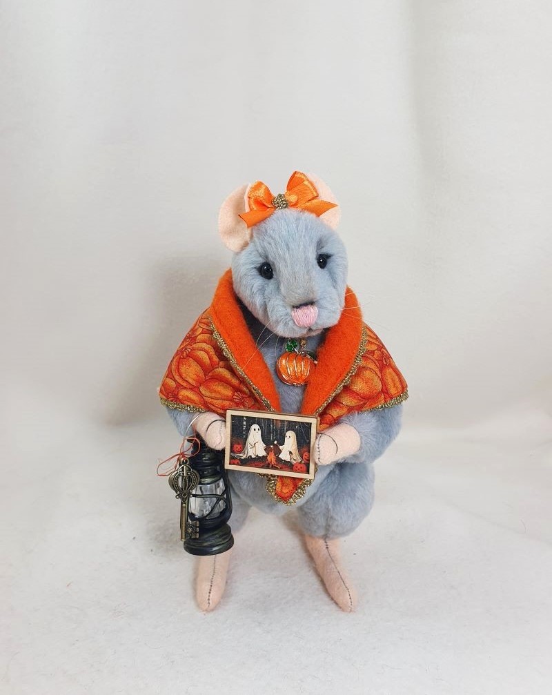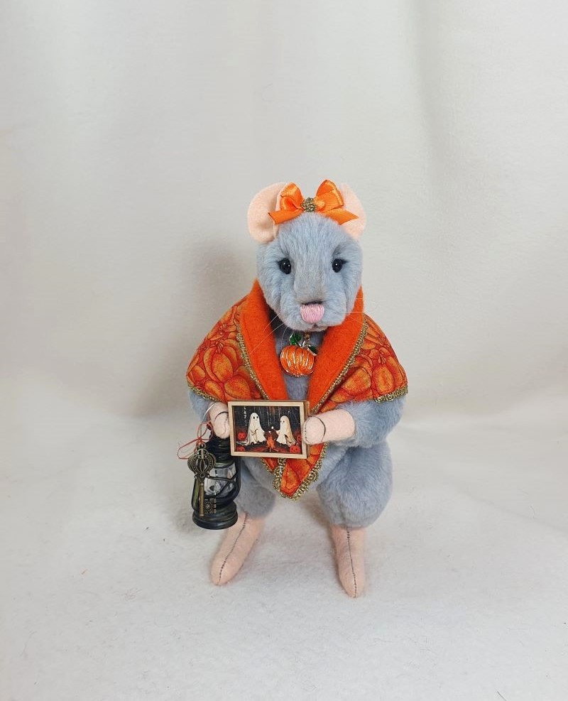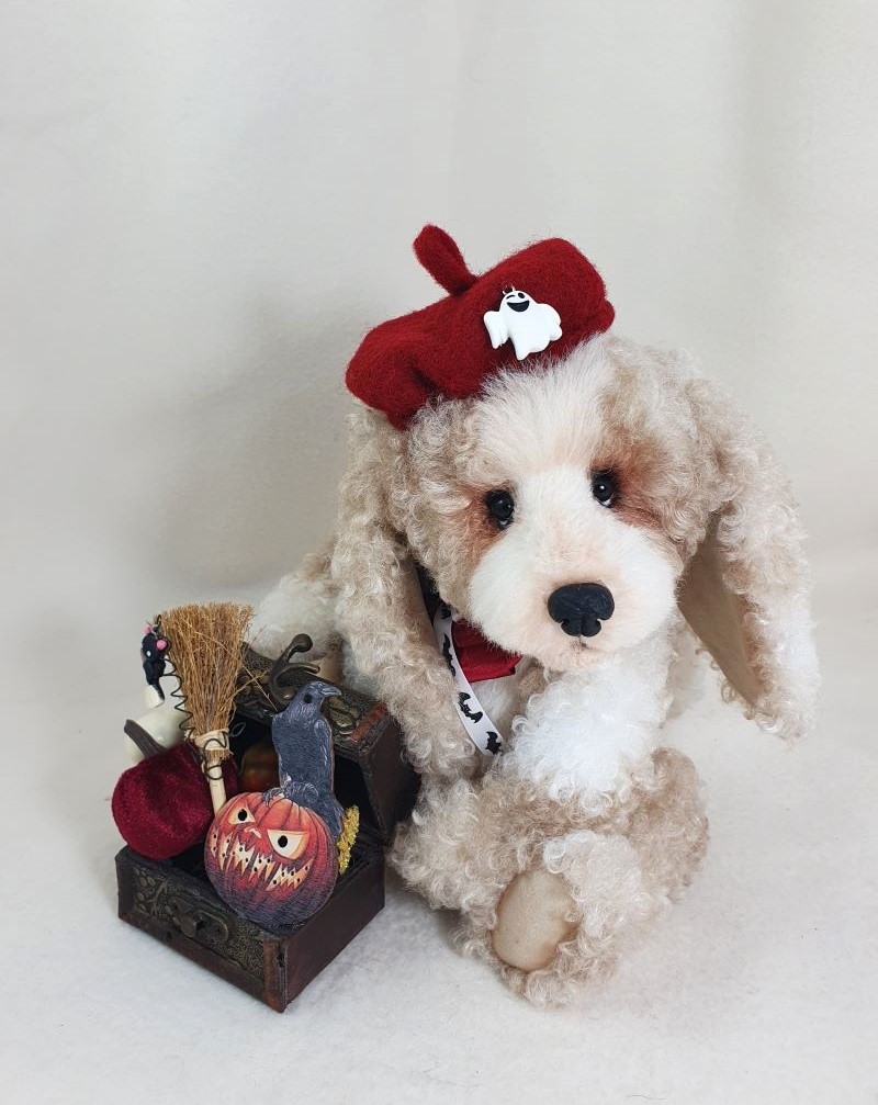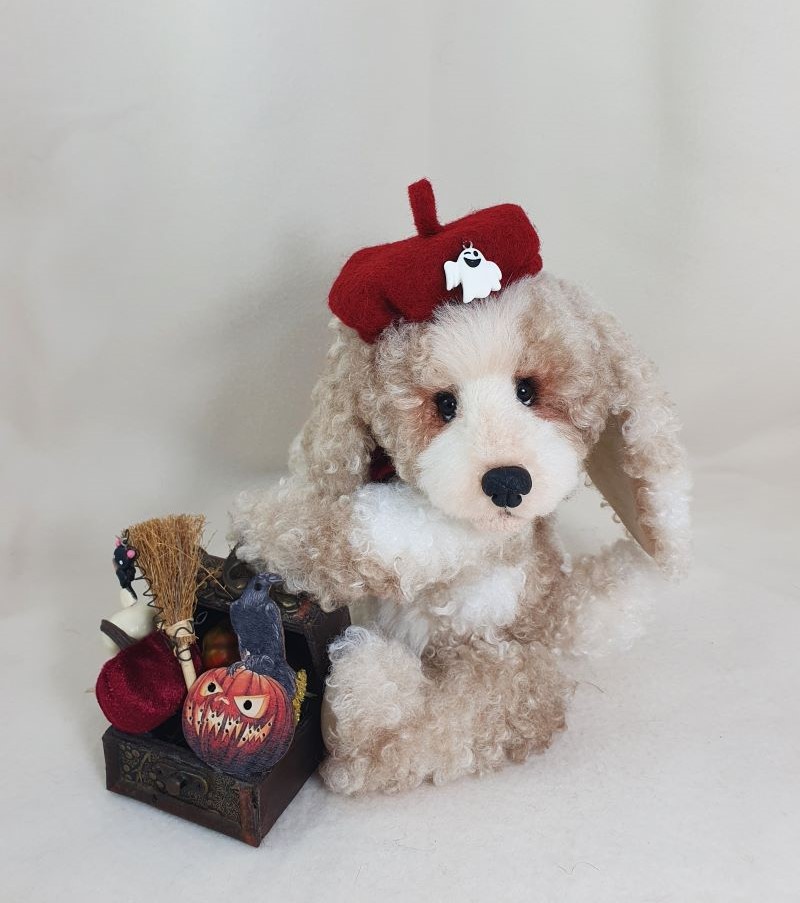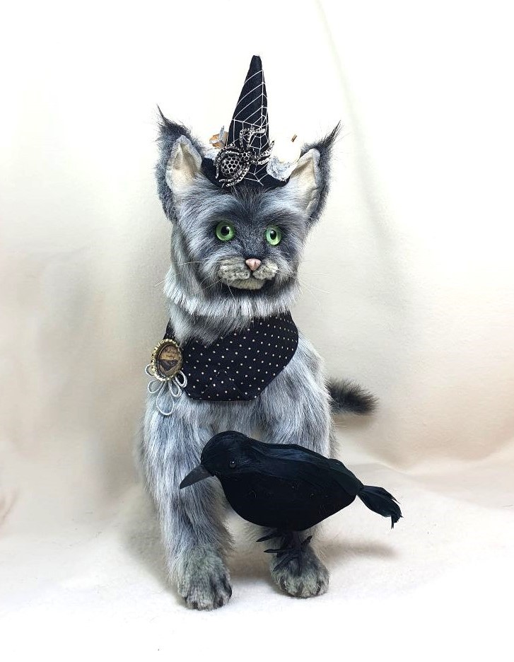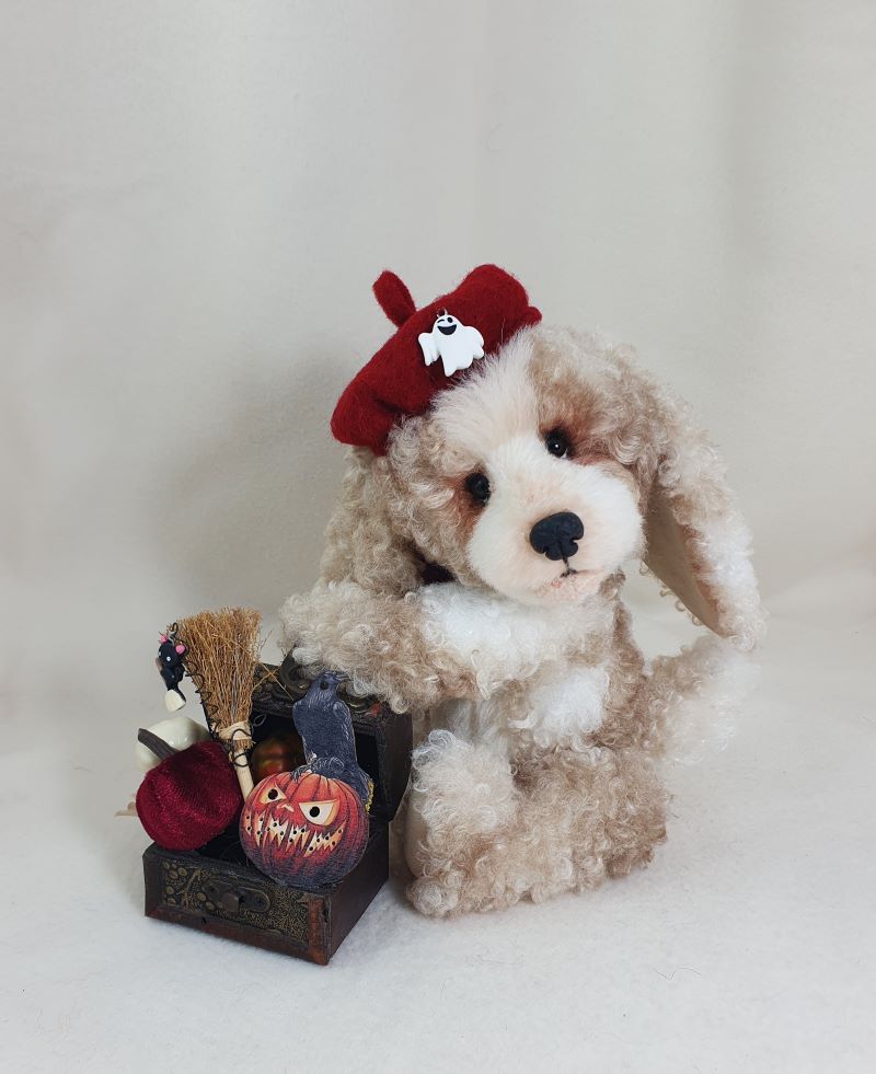Decorations: hat 100% wool fiber, Ghost pendant, bow at the neck, vintage box with battery-powered pumpkin lights, tree, broom pendant, wooden crow.