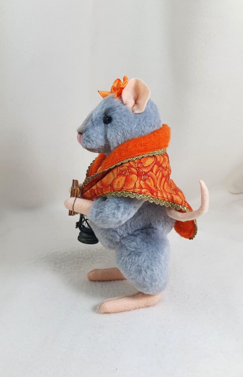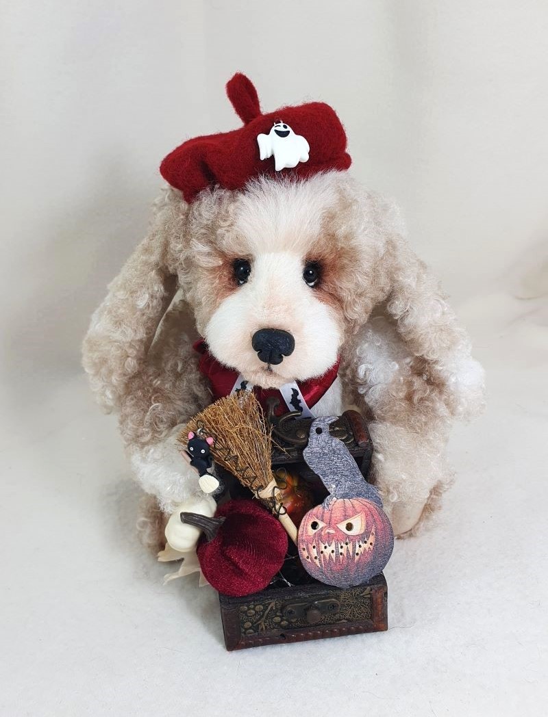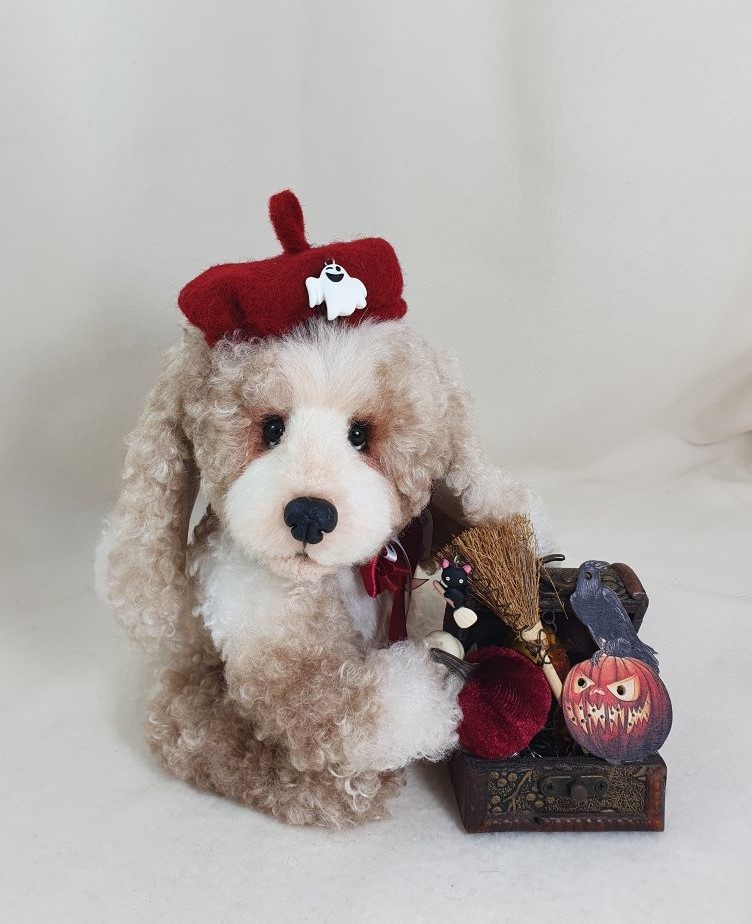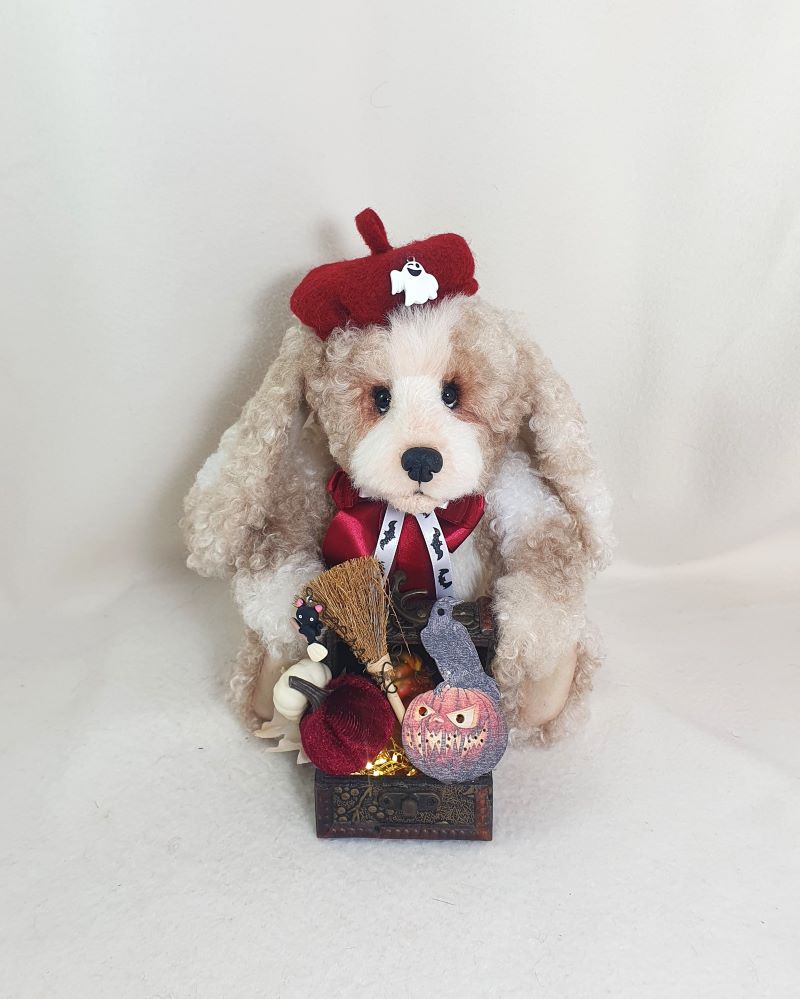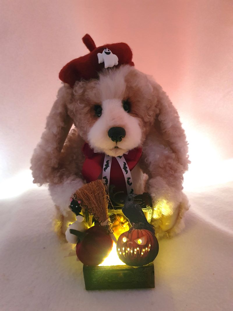Decorations: hat 100% wool fiber, Ghost pendant, bow at the neck, vintage box with battery-powered pumpkin lights, tree, broom pendant, wooden crow.